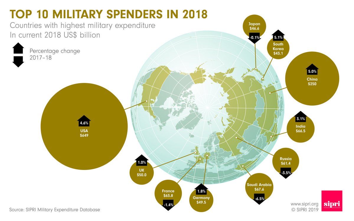 Сегодня на глаза попалась довольно интересная инфографика от Стокгольмского института исследования проблем мира (SIPRI), на которой расписаны 10 стран с крупнейшими расходами на оборону и динамика их изменений в 2017-2018 годах. Отрадно видеть в их числе и Россию, несмотря на санкции и другие трудности. Хотя почётное шестое место и сокращение расходов на 3.5% как-то плохо вяжется с транслируемыми из телевизоров речами про прорывы в области ВПК, а также большое количество построенных пароходов, самолётов и ракет.