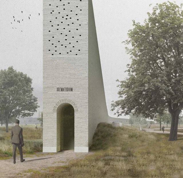 Узкое кирпичное здание авторы растянули в коридор. Здесь будут расположены вход, колумбарий и мост через небольшой канал. Все технические помещения, включая печь и хранилище гробов, архитекторы спрятали под землёй.