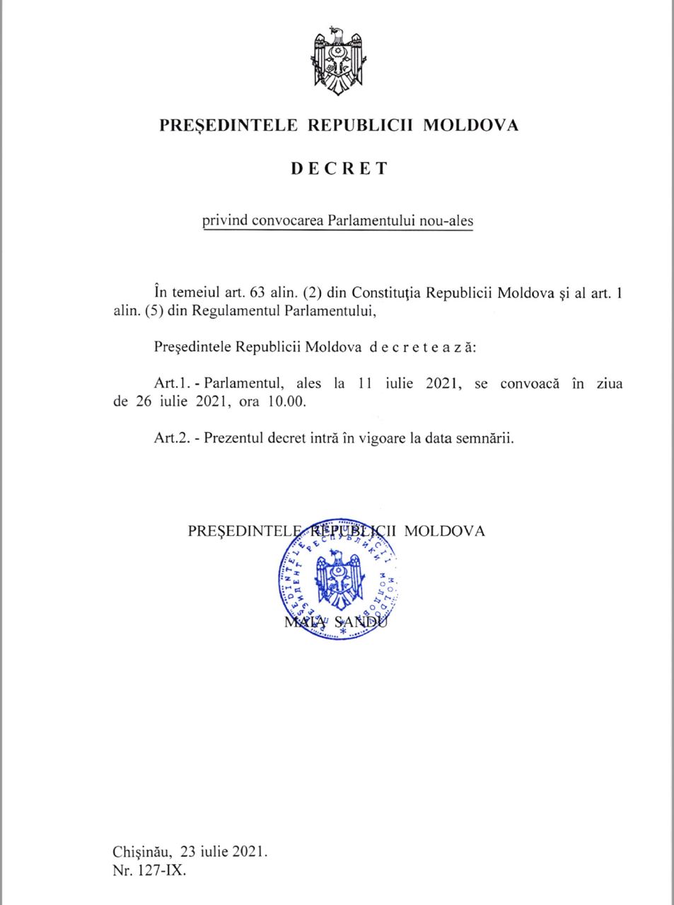 🟡 Luni, 26 iulie, ora 10:00 - Ședința de constituire a Parlamentului de Legislatura XI. Decretul a fost semnat.