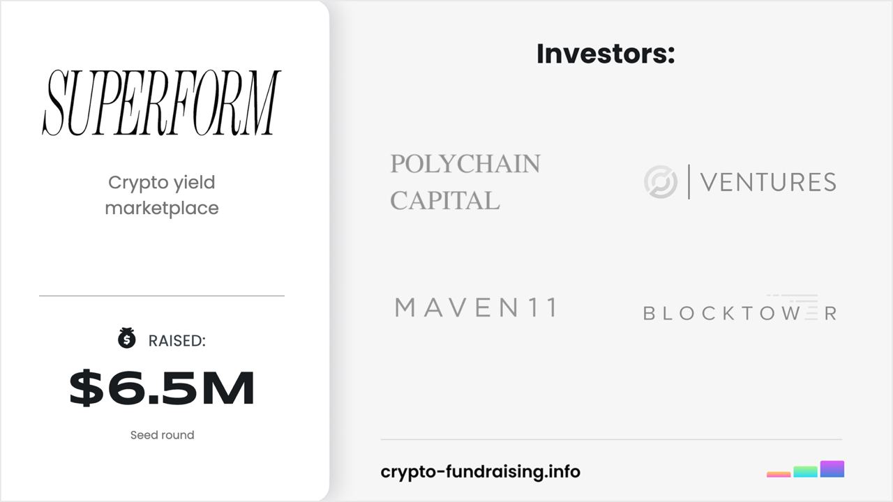 Crypto yield marketplace Superform Labs raised $6.50M in a Seed funding round led by Polychain Capital, with participation from BlockTower Capital, Maven 11 Capital, Circle Ventures, Arthur Hayes, Marc Bhargava, Avi Felman, Michael Bucella, Bryan Pellegrino.