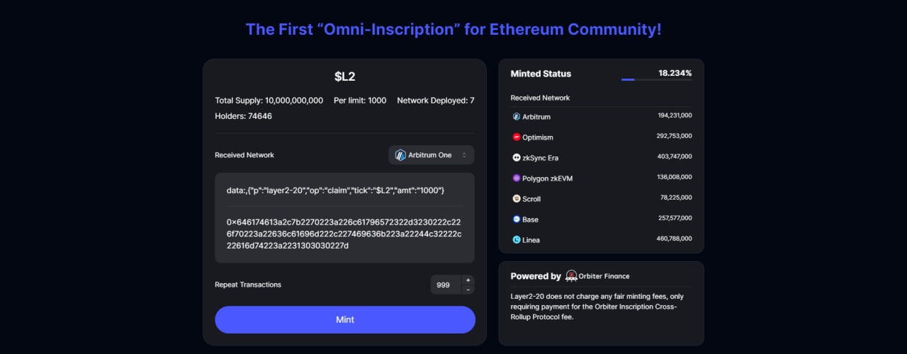 ▪️ Минт инскрипций от Layer2-20, при поддержке Orbiter Finance. Полный ДИОР и НФА.