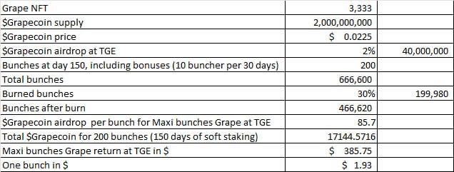Выкупать коды на ОТС, либо купить NFT со вторички. Коды сейчас очень дешёвые 20-30$ за штуку. При том, что будет гарантированная аллокация на 0,3 $ETH выглядит очень смарт. Для окупа вложений и выхода в + нужно х5, это капитализация в 7,5 миллионов долларов на старте. Многие проекты сделанные чисто для спекуляции выходящие через Dao Maker доходят до капитализации в 10 миллионов долларов, поэтому капитализация токена в 7,5 миллионов долларов для такого проекта как The Grapes точно не проблема.