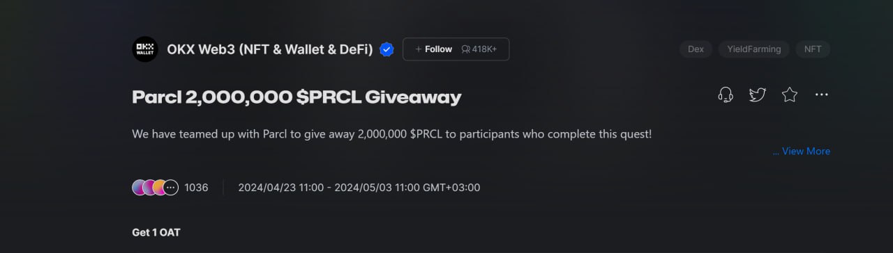 Суть ивента это забрать OAT на Galxe, за простые задания, за что мы получим 67 токенов PRCL, что по текущему курсу около $40. Всего на ивент выделено 2млн PRCL, а значит, что многим хватит