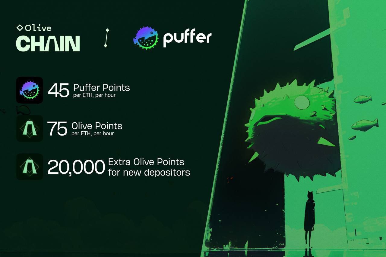 Сейчас мы можем фармить Olive Points под Airdrop, который уже Confirmed и скорее всего выйдет с CoinList. Также вышло партнерство с Puffer, то есть теперь сможем получить доп. Puffer Points и Olive Points