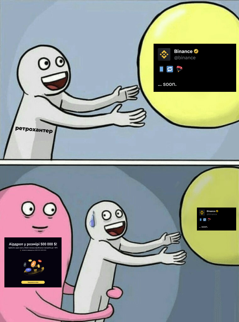 Нещодавно Binance забайтив усіх ретрохантерів, опублікувавши твіт з надписом "📱 🔁 🪂". Усі відразу почали крутити транзакції в мобільному гаманці Binance, але їх дуже швидко обломали.