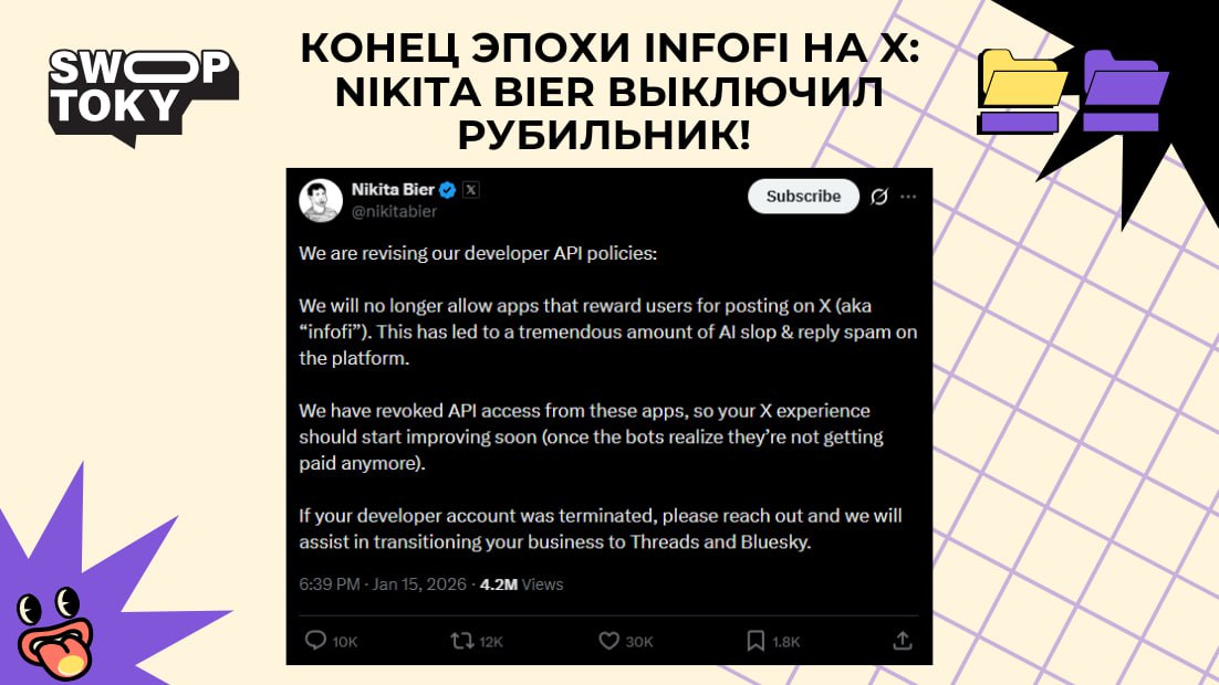 🟡 Конец эпохи InfoFi на X: Nikita Bier выключил рубильник!