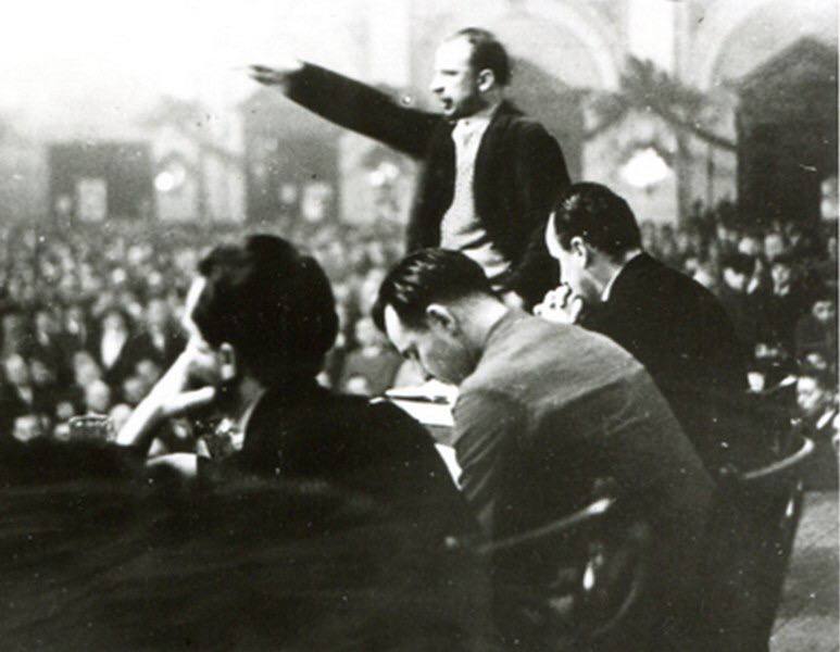 На фото: публичные дебаты в Берлине в январе 1931 г. между главой столичного горкома КПГ Вальтером Ульбрихтом (стоит) и главой столичного горкома НСДАП Йозефом Геббельсом (сидит на переднем плане). Одним из аргументов Ульбрихта против нацистов являлось то, будто те действуют в интересах капиталистов, в том числе и еврейских.