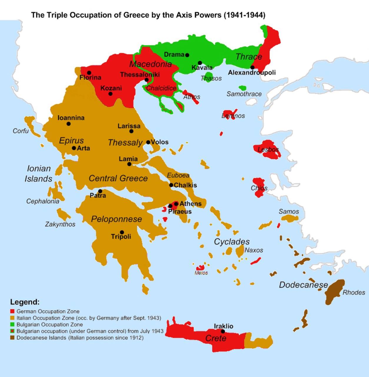 По итогам Греческой кампании в апреле 1941 г. территория Греции была оккупирована Германией, Италией и Болгарией.
