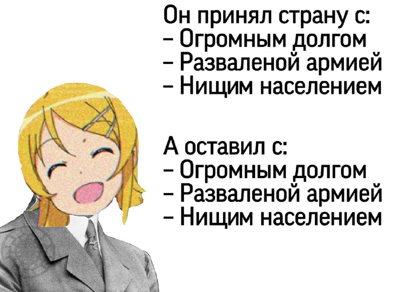 Но вот что касается нижней части мэма, то здесь ни убавить, ни прибавить. Пожалуй, в истории найдётся совсем немного правителей, чья политика оказалась бы НАСТОЛЬКО провальной и катастрофичной для того народа, кому не посчастливилось оказаться под таким руководством.