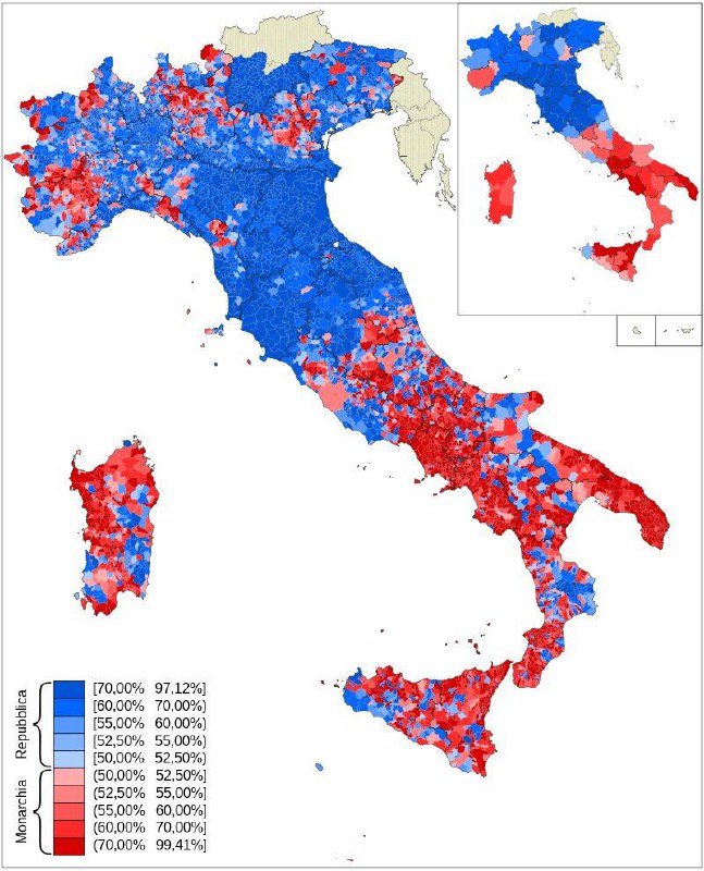 Однако ему всё же не удалось переломить общественные настроения в пользу Савойского дома. При явке в 89% республиканцы победили монархистов с соотношением 54% к 46%. Референдум ещё раз продемонстрировал региональный раскол Италии. Традиционалистский аграрный Юг, который в годы Гражданской войны находился под союзной оккупацией, и где формально всё это время сохранялась королевская власть, проголосовал за монархию. Модернистский индустриальный Север, где с 1943 по 1945 гг. друг против друга воевали фашисты-республиканцы и антифашисты-республиканцы, проголосовал против монархии, и тем самым обеспечил республиканское будущее Италии.