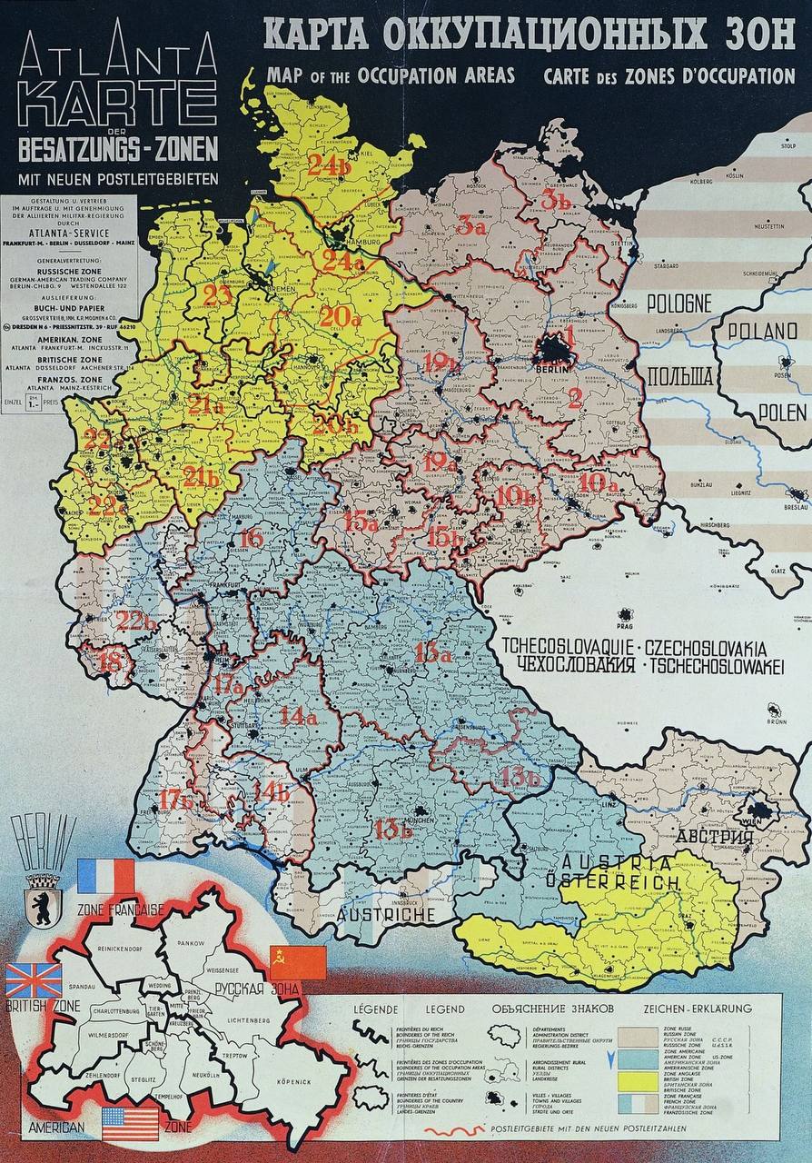Посмотреть карту оккупационных зон Союзников в Германии и Австрии в высоком разрешении можно тут.