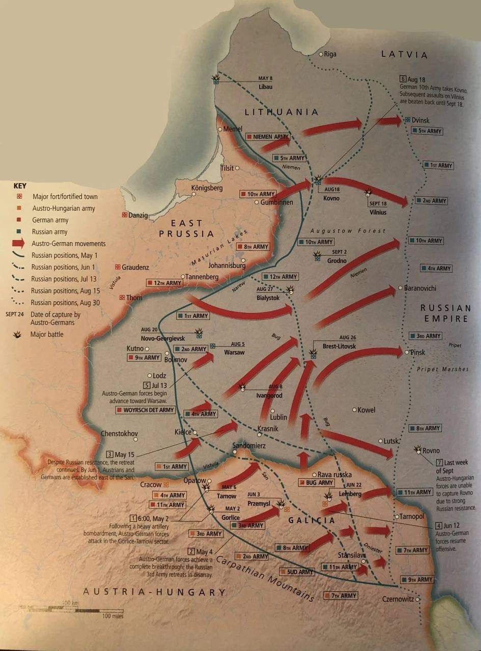 1915 г. вошёл в историю как год «Великого отступления» Русской императорской армии. Будучи страной с менее организованной промышленностью, чем у её противников и союзников, Россия медленнее мобилизовывала экономику, и это неизбежно вело к более серьёзным перебоям со снабжением на фронте, чем у Германии и Австро-Венгрии (по крайней мере, по состоянию на 1915 г.). Вражеское наступление, начавшееся в мае, привело к тому, что к октябрю русские оставили Галицию, Волынь, Польшу, Литву, Курляндию и Западную Белоруссию.