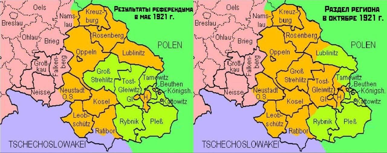 Долгожданный референдум состоялся 20 марта 1921 г. За Германию проголосовали 60% , за Польшу – 40%. Союзники оказались в замешательстве. Дело в том, что на юго-востоке региона получилось так, что проголосовавшие за Германию города оказались посреди проголосовавших за Польшу сёл. И как это делить? Снова проявились «версальские» разногласия между французами и британцами. Первые желали давить немцев «до талого» и выступали за передачу как можно больших территорий полякам. Вторые были куда более лояльны к немцам, желая сохранить сильную и платёжеспособную Германию для баланса сил в Европе, так что британцы, наоборот, отстаивали сохранение как можно больших территорий в составе Рейха.