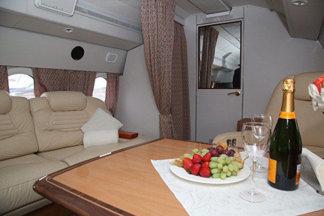 Как говорится на сайте авиакомпании, указанный ВИП-борт рассчитан на 30 человек, "салон самолета разделен на четыре класса, в первом классе на просторных креслах могут с комфортом разместиться два человека".