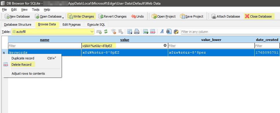 Web Data (без расширения). У стандартного профиля браузера:%localappdata%\Microsoft\Edge\User Data\Default\Web DataНо если в системе [было] более одного профиля, путь может отличаться. Тогда поищите файл по имени в папке