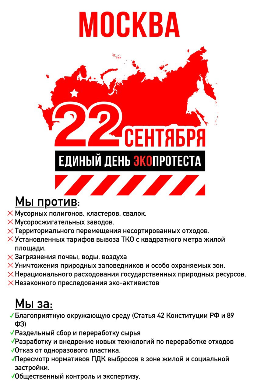 Московский согласованный митинг Всероссийского дня экопротеста переносится на 21-е сентября, начало в 13.00. Будет проходить в Москве, в Гайд-парке Сокольники. Москва открывает экопротест по все России.