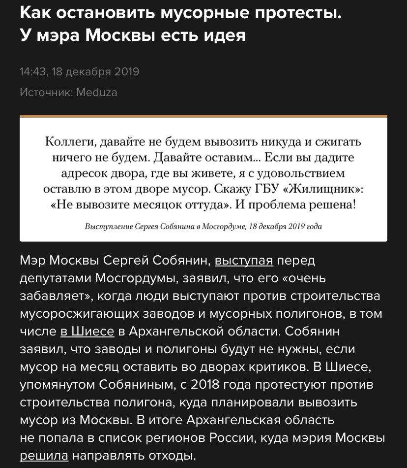Мэр Москвы Сергей Собянин, выступая перед депутатами Мосгордумы, заявил, что его «очень забавляет», когда люди выступают против строительства мусоросжигающих заводов и мусорных полигонов, в том числе в Шиесе в Архангельской области. Собянин заявил, что заводы и полигоны будут не нужны, если мусор на месяц оставить во дворах критиков. В Шиесе, упомянутом Собяниным, с 2018 года протестуют против строительства полигона, куда планировали вывозить мусор из Москвы. В итоге Архангельская область не попала в список регионов России, куда мэрия Москвы решила направлять отходы.