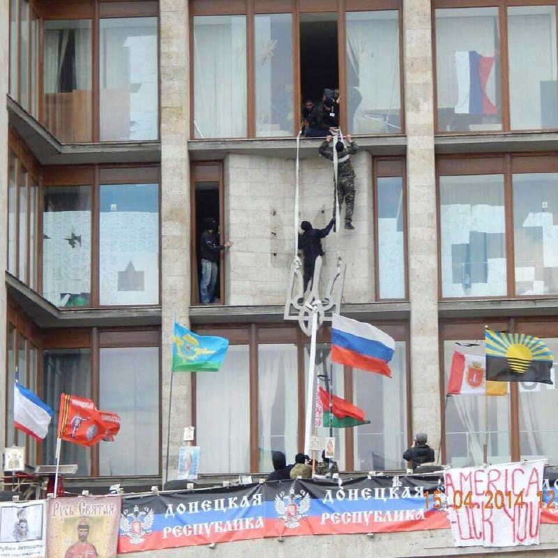 На фото — исторический момент. Восставшие снимают украинский герб со взятого штурмом здания Донецкой администрации.