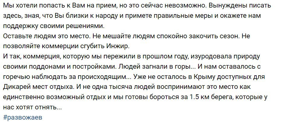 Развожаев не дотерпел до избрания и запустил свой принтер запретов. Начал не с самого очевидного - с запрета дикого отдыха на Инжире. Очевидно, что Михаил является сторонником "турецкого" отдыха по системе "всё включено". Он постоянно твердит о создании какого-то "туристического кластера" вместо "небезопасных" пляжей типа Немецкой балки. Присутствие в избирательной "команде губернатора" директора апартаментов "Аквамарин" как бы намекает о формате развития туризма в городе. Фанаты Инжира тоже понимают куда дует ветер относительно их любимого места.
