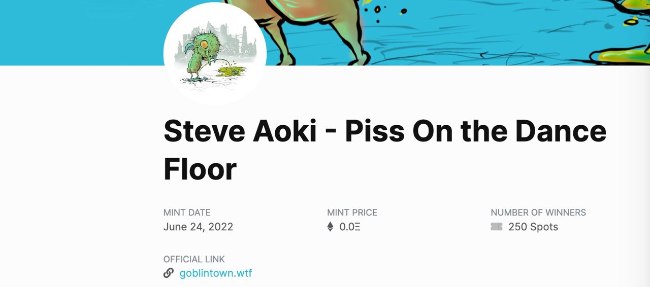 Во-первых. Никто не постил этот преминт в твиттере, речь идет об Aoki и гоблинах. На официальных страницах нет упоминаний рафла. Единственное, что мы нашли - это ссылка на рафл у какого-то ноунейм аккаунта в твиттере, вот ссылка на него. Парень говорит, что преминт не фейк, если спрашивать его про факты, он отвечает DYOR. Полистать хештег пришлось долго, чтобы добраться до поста.