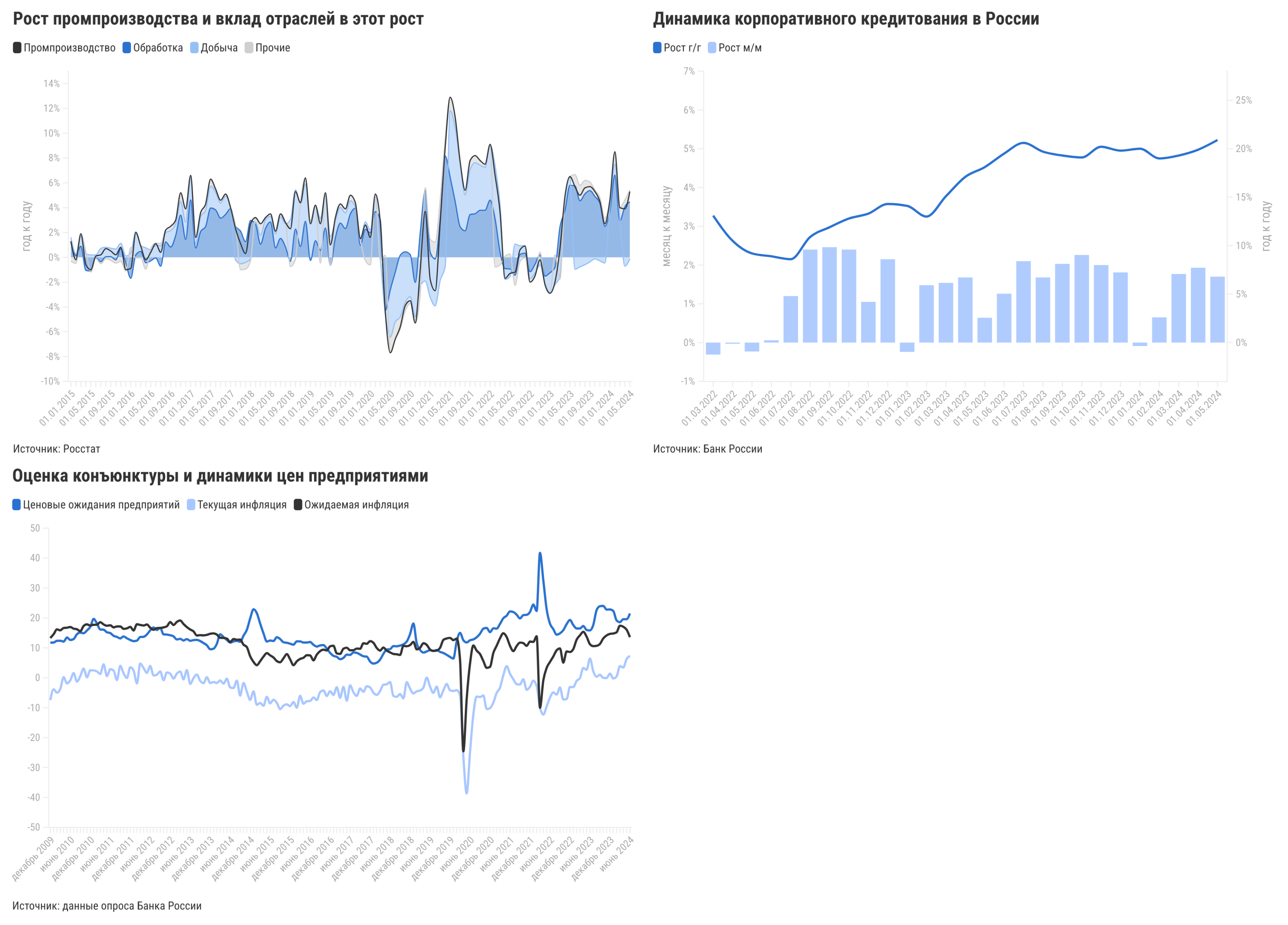 Объемы промышленного производства в России в мае сохранили уверенный рост. Он поддерживался сильным внутренним потребительским и государственным спросом и сопровождался увеличением объемов кредитования, несмотря на высокий уровень рыночных ставок. В июне опросы отражают сохранение высокой бизнес-активности при некотором снижении оптимизма на будущее. Ценовые ожидания и данные текущей инфляции показывают повышенное давление. По предварительной оценке, годовая инфляция в июне превысила 8,5%, что поддерживает наши ожидания повышения ключевой ставки Банком России до 17,0% на заседании 26 июля.