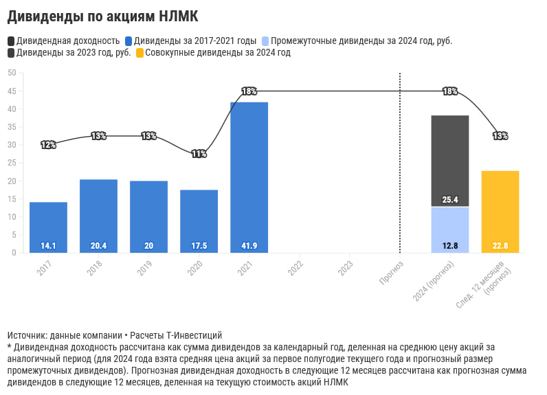 Мы ожидаем, что НЛМК направит на выплату дивидендов 100% от FCF за 2024 год. По нашим расчетам, размер дивидендов по акциям НЛМК в следующие 12 месяцев может составить 22,8 рубля на акцию, доходность к текущей цене — 13%.
