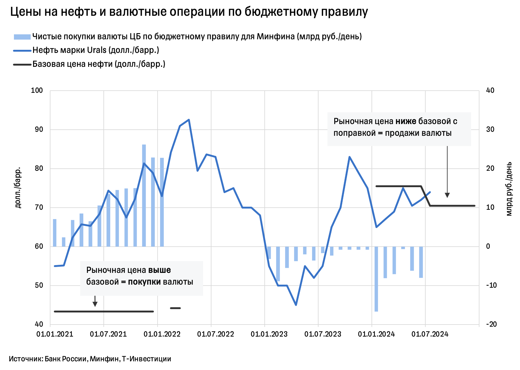 Валютная часть бюджетного правила действует в России с 2017 года. Ее идея в том, чтобы сгладить влияние нефтяных колебаний не только на параметры госбюджета, но и на валютный рынок. Когда цены на нефть растут выше базовой цены, госбюджет копит излишние доходы в ФНБ, а ЦБ по поручению Минфина проводит соответствующие покупки валюты, предотвращая избыточное укрепление рубля. И наоборот. Однако в последние годы ФНБ проводил масштабные операции, не связанные с основным бюджетным правилом и базовой ценой на нефть. Речь об антикризисных расходах в 2020-м и 2022—2024 гг. и операции по финансированию внутренних инвестиционных проектов/активов. С 2024 года ЦБ начал учитывать все эти операции при проведении интервенций. С 2022-го регулятор покупает на валютном рынке только юани.