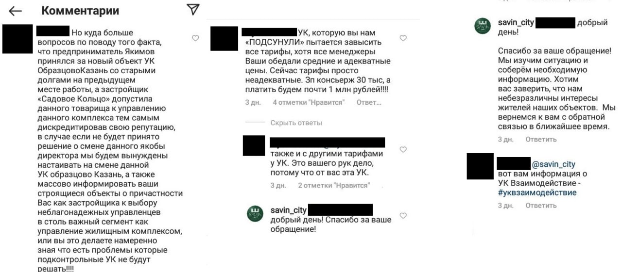 Жильцы говорят о том, что УК «Образцово Казань» уже начала выдумывать фантастические тарифы на свои услуги, в связи с чем Инстаграм-аккаунт жилого комплекса завалили соответствующими обращениями, а также вопросами: каким образом человек-банкрот с разодранной репутацией смог получить в управление ЖК бизнес-класса. У администрации жилого комплекса ответов, само собой, нет. Поэтому на обращения приходит дежурная фраза «мы соберем информацию и ответим».
