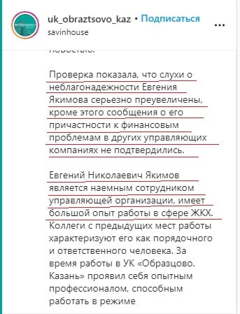 Не в последнюю очередь собственники разволновались и в связи с появлением товарища Якимова, который в спорных ситуациях умеет включить гопника, коим, в принципе, и является. Тем не менее, УК «Образцово Казань», чей головной офис расположен в Москве, ответило на все претензии отсутствием доказательств неблагонадежности товарища Якимова, назвав его опытным жилищником.