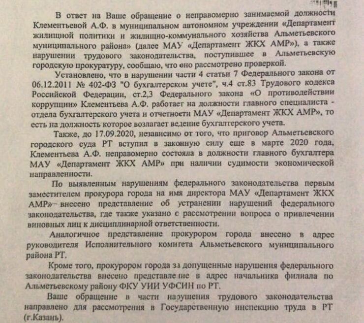 Даже после официальных запросов в прокуратуру и после полученных разъяснений Клементьева А.Ф. продолжает работать в гос. учереждении и была переведена на должность главного специалиста отдела бухгалтерскогоучета и отчетности.