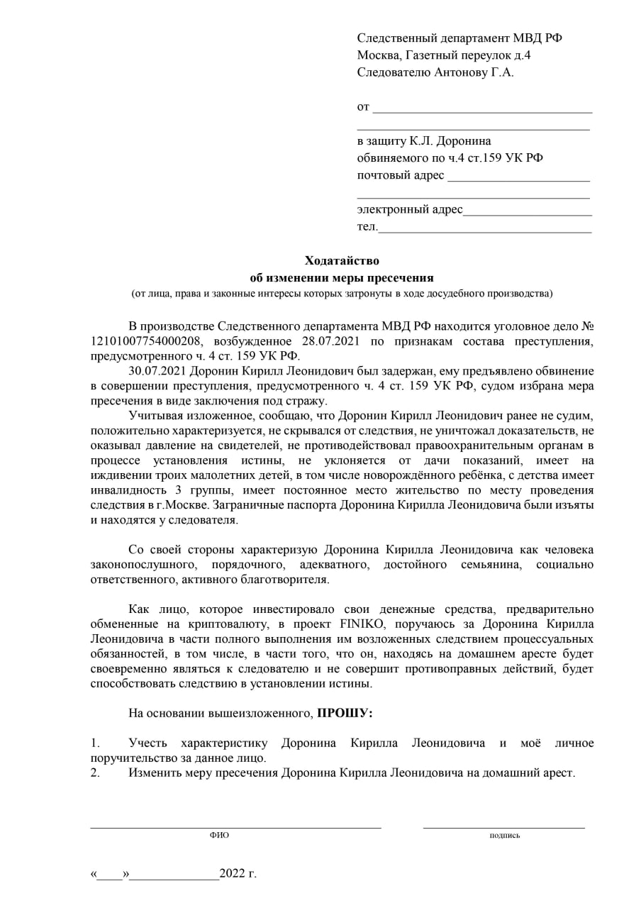 Для адептов Finiko и Доронина даже подготовлен шаблон «ходатайства» в следственные органы МВД об изменении ему меры пресечения (см. прикрепленное фото). Ведь если его освободят из следственного изолятора под домашний арест, то он тут же займется возвратом денег.