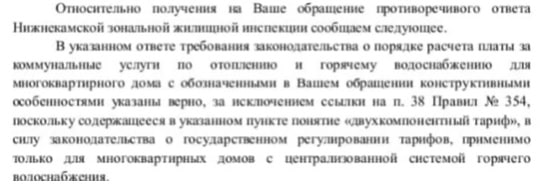 Конечно рачительные граждане обратились в ГЖИ РТ за пересчетом и возвратом кровных средств. Но г-н Крайнов С.А. не был бы Крайновым если бы уступил гражданам. Он подписал ответ, в котором указал, что понятие "двухкомпонентный тариф" не относиться к тем МКД в которых есть ИТП и ГВС создается в подвале через теплообменник.