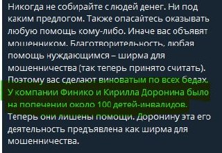 Добрый день, якудза. Клоуны из Финико ударились в грязные манипуляции что якобы Доронин держал на попечении сотни детей инвалидов, а когда злые силовики его закрыли то дети остались без средств! Специально привожу цитату, чтобы было видно как подменяются понятия и как пытаются удержать тех немногих, кто еще остается на стороне Доронина и его подельников. А очень многоие продолжают верить, что Кирилл ангел во плоти и обязательно вернет деньги.