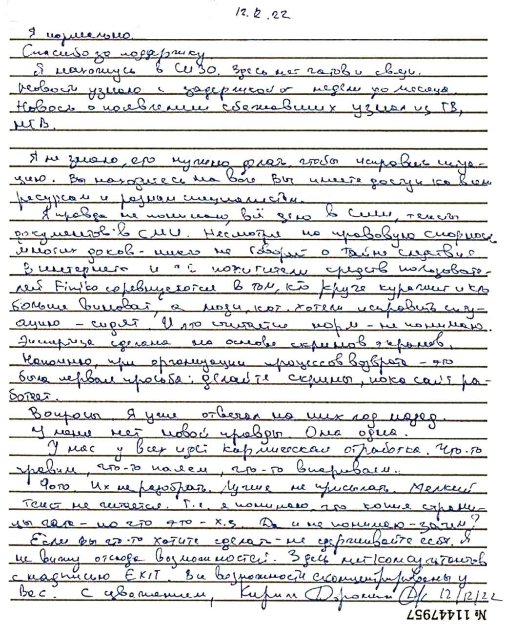 Так описывает ситуацию вокруг криптофинансовой пирамиды Finiko ее сооснователь Кирилл Доронин, который продолжает писать письма из СИЗО, пока следствие носится с итоговым обвинением фигурантам уголовного дела. Само собой, под «людьми, хотевшими все исправить», Кирилл подразумевает себя и продолжает сокрушаться, что никто публично не озвучивает его собственную «правду».