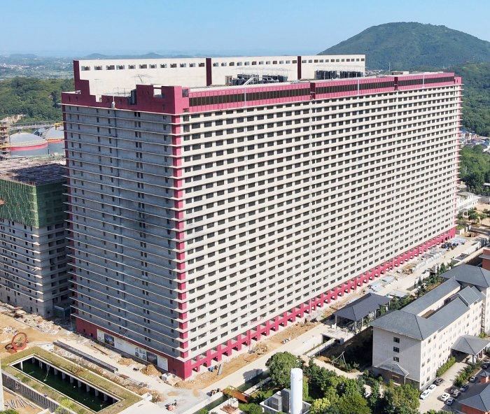 В небольшом городке Эчжоу в центральном Китае начал работу свиноводческий комплекс, рассчитанный на выращивание не менее миллиона свиней в год. Его особенность в том, что все животные помещаются в отдельных камерах внутри гигантского 26-этажного здания. Это крупнейшая постройка в городе и одна из самых больших свиноферм в Китае.