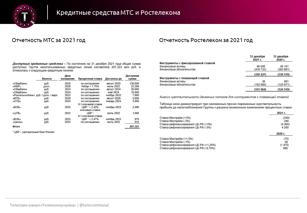МТС и Ростелеком нам интересны не только как компании, которые занимают лидирующие позиции на рынке, но и как организации, торгующиеся на биржах. «Телекоммуналка» изучила последние финансовые отчетности компаний и обнаружила, что у МТС почти все кредиты с плавающей ставкой, а у Ростелекома – примерно четверть. В нынешнее время — это безумный риск.