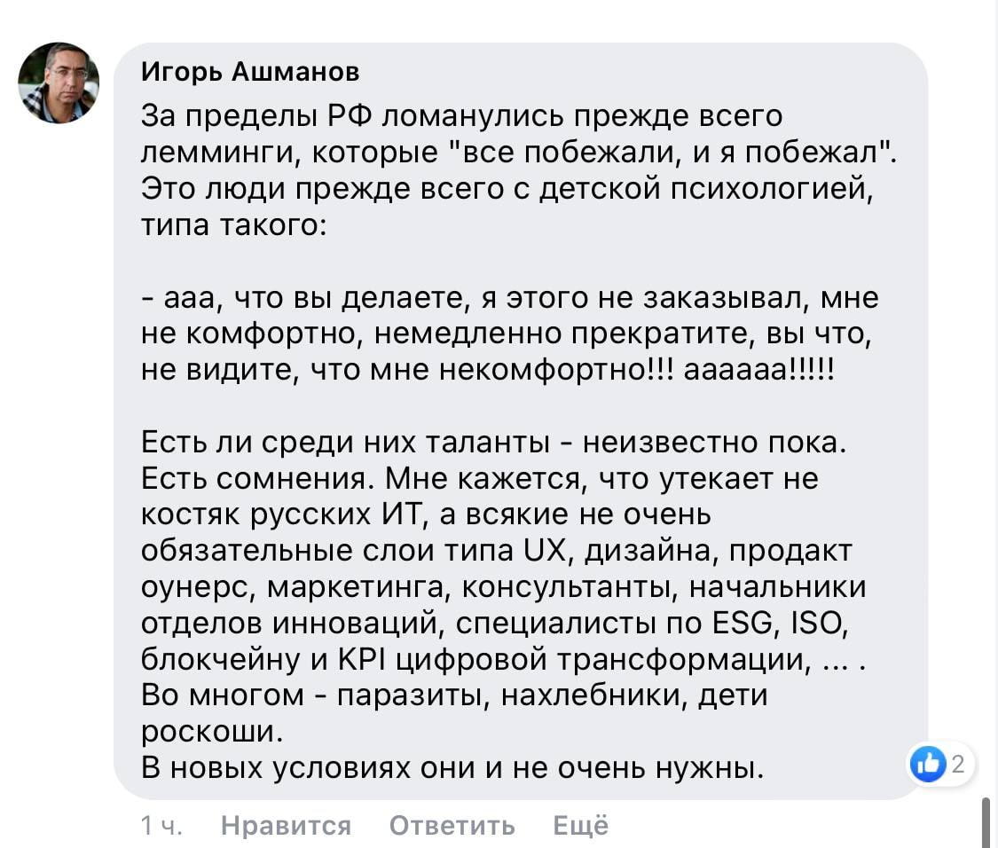 Наткнулись на скрин интереснейшего комментария на Facebook (запрещенная организация в России) предпринимателя Игоря Ашманова. Будем честны, мы до последнего считаем, что человек, будучи на таком уровне, не может так изъясняться, и надеемся, что это неправда. Сейчас эту публикацию уже не найти, зато, на TJ можно прочитать комментарии, которые Ашманов оставляет, в т.ч. под обсуждением данного скрина. Давайте абстрагируемся от личности и посмотрим на суть сообщения.