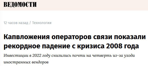 В последнее время очень нравятся заметки «Ведомостей». Уникальное искусство создания новостей на ровном месте. Жаль, что подобные вещи расходятся широко, все же «большое СМИ». Вчера удивили «убийством Марвина». Видимо, в подвалах Таганки. Посмеялся, ждите новостей. Сегодня заголовок еще громче: «Капвложения операторов связи показали рекордное падение с кризиса 2008 года».
