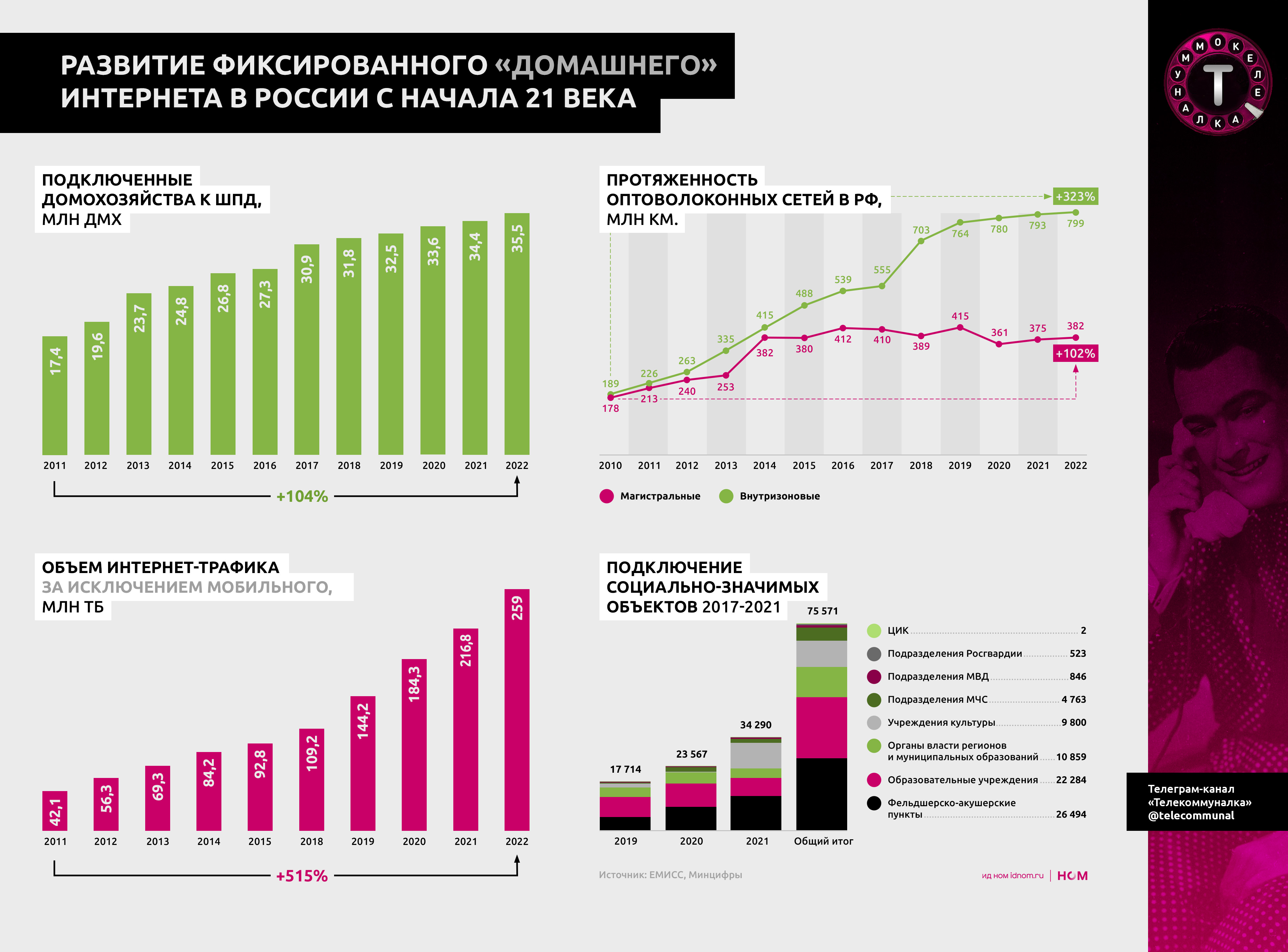 С 2010 по 2022 год протяженность оптических линий (магистральные + внутризоновые) в России выросла в 3,2 раза: с 366 тыс. км до 1.180 тыс. км.