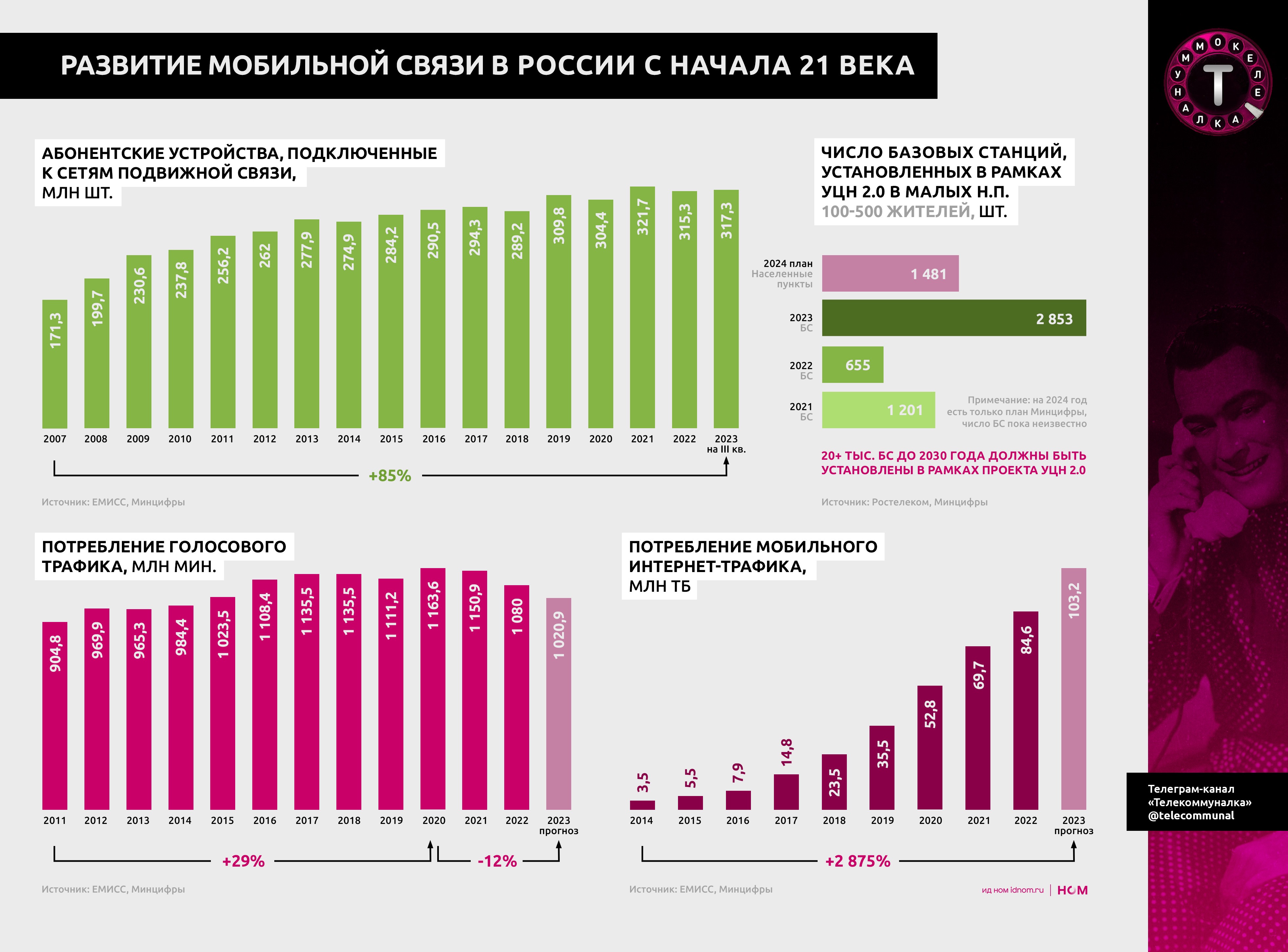 Продолжаем рассказывать о развитии телекома в России в XXI веке. В этот раз – мобильная связь. В далеком 2004 году министр связи Леонид Рейман заявлял, что скоро количество абонентов мобильной связи и фиксированной сравняется, достигнув 30-35 млн. Через три года количество мобильных абонентов достигло 171,3 млн, а в III кв. 2023 – 317,3 млн. В эту цифру входят не только мобильные телефоны, которых у некоторых даже два, а то и три, но и SIM-карты интернета вещей, о котором ранее и не думали.