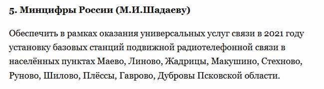 Не понятно, почему такие решения приходится принимать премьер-министру, но факт остается фактом. Всем абсолютно понятно, что заход в такие поселки – прерогатива Ростелекома, ибо история почти неокупаемая. И с ним должны работать местные власти. Губернатор Псковской области должен был выйти на местное отделение госоператора с предложением о приоритизации обозначенных поселков, а не Михаил Мишустин ставить задачу Максуту Шадаеву, которым вместо местных властей приходится определять, куда втыкать базовую станцию.