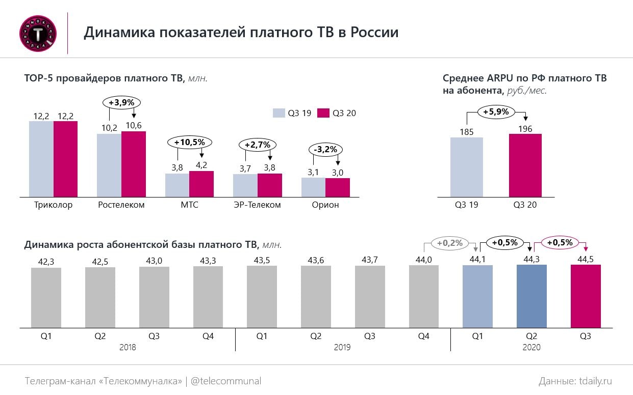 В 3 квартале число абонентов платного ТВ выросло на 205 тысяч и составило 44,5 млн. Средний ARPU – 196 рублей/мес. Но в сравнении с периодом карантина, темп замедлился.