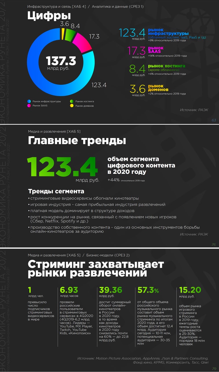 11. Рост сегментов развлечений: онлайн-видео (19,4 млрд руб., +59%), онлайн-музыка (8,4 млрд, +100%), онлайн-игры (90,2 млрд руб., +30%), электронные книги (5,4 млрд, +25%).