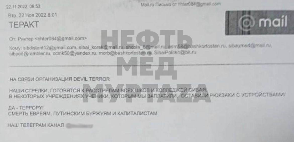 Сегодня мэр Сибая сообщил, что в дежурную часть МВД поступили угрозы о том, что в местных школах и колледжах города начнется стрельба.
