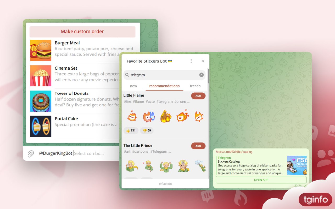 • Sekarang aplikasi web dapat dibuka melalui tautan, tombol inline atau mode inline, tidak hanya di pesan pribadi, tetapi juga di grup. Perubahan ini memungkinkan semua pengembang membuat bot web untuk obrolan grup. Sebelumnya, fitur ini hanya tersedia untuk bot yang pemiliknya membayar untuk integrasi di menu "Lampiran". Namun, menambahkan bot ke menu "Lampiran" hanya dapat dilakukan dengan biaya.