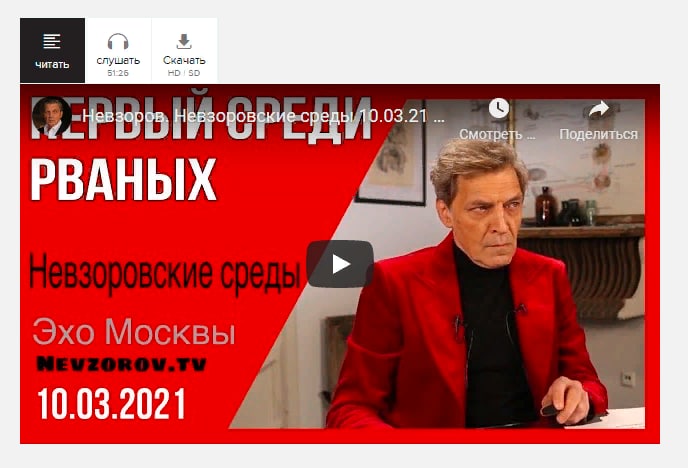 Зная о совершенно омерзительном информационном фоне, транслируемым либеральными СМИ, я туда особо и не совалась, и тем более слушать Невзорова мне и в голову не приходило. Я же помню его «600 секунд». «Неужели у кого-то будет желание окунаться в эту помойку вновь» — думала я. Ну вот, заглянула. А потом посмотрела количество просмотров его «Сред...» и «Наповал» – семьсот тысяч, триста, шестьсот, миллион… Пусть там будет половина, даже две трети ботов, но даже оставшаяся одна треть – это настолько много, что реально становится страшно от того, сколько же некродерьма он успел влить в сознание слушателей.