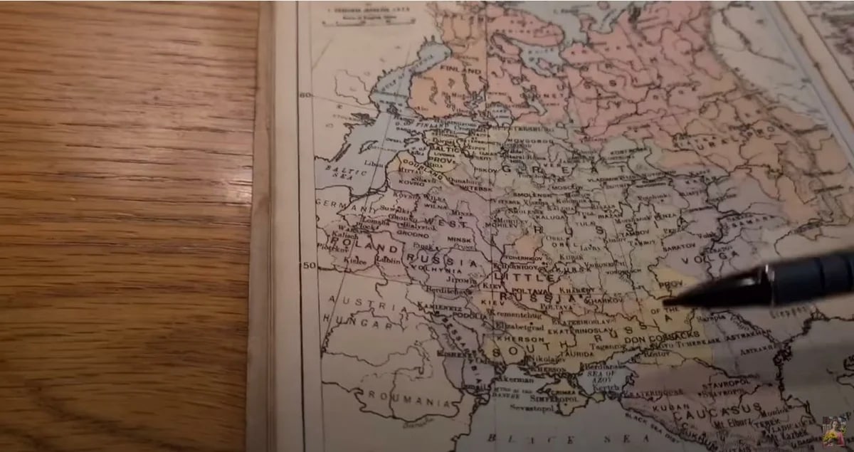 А тут вот Надежда, бывшая гражданка России, живущая в Англии, опубликовала видео, в котором рассказала, что пять лет назад купила старый географический атлас в историческом центре. Атлас этот напечатан не Кремлём, и даже не в Российской империи, а именно в Англии в конце XIX века. И в этом атласе не оказалось... Украины.