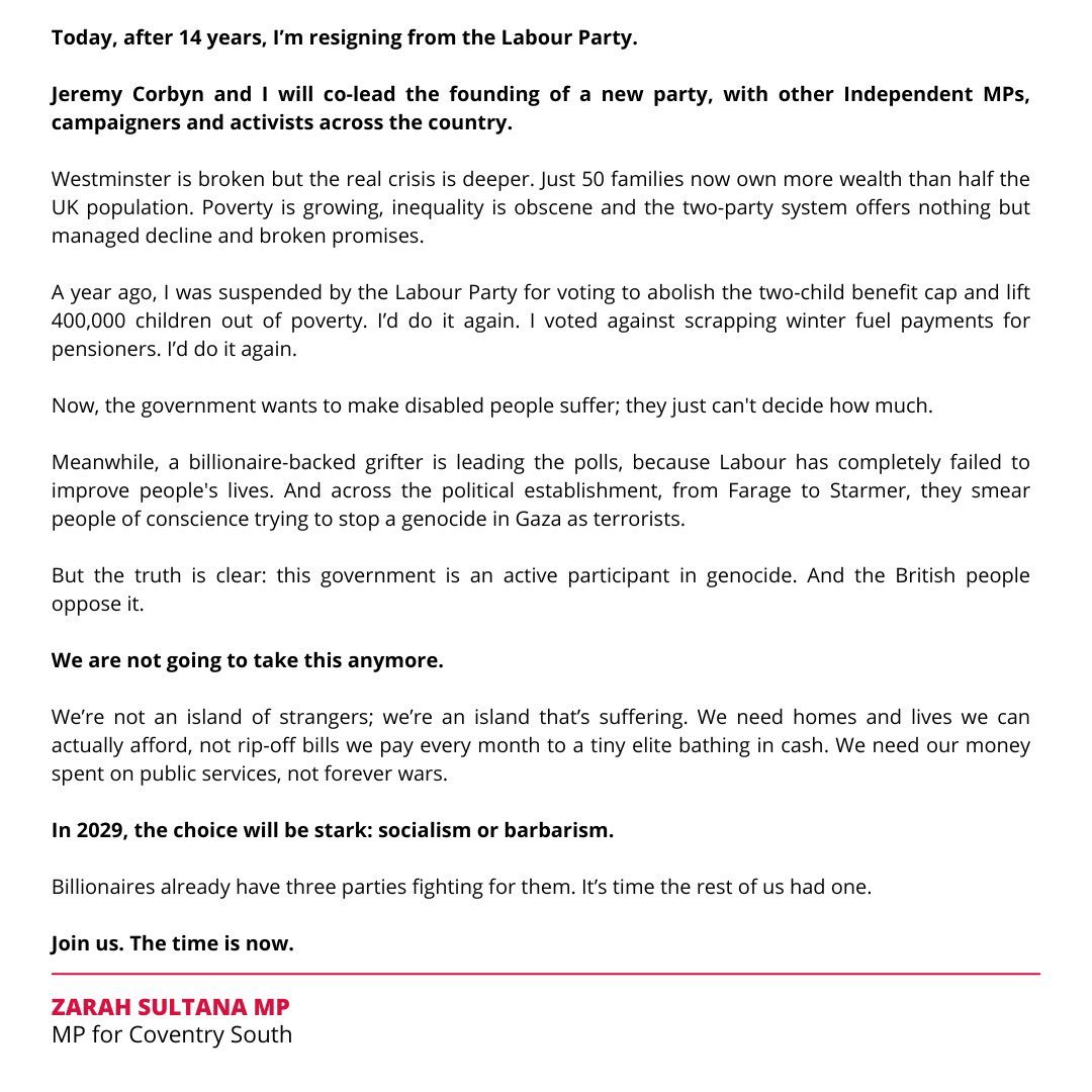 Співзасновницею нової партії разом з Корбіним стане депутат Зара Султана, яка оголосила, що йде з Лейбористської партії, щоб створити нову партію. Султана стверджує, що до них з Корбіним приєднаються інші депутати та активісти.
