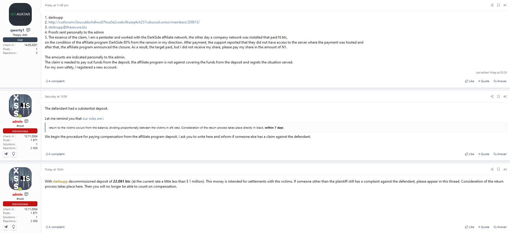 Администратор XSS снял с депозита владельцев ransomware Darkside больше 22 BTC (около 1 млн. долларов).