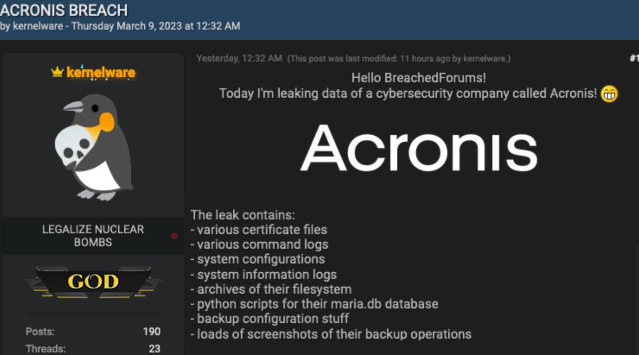 Компания предлагает решения для резервного копирования, аварийного восстановления, защиты от вирусов и защиты конечных точек. Представители Acronis заявили, что учетная запись одного клиента была скомпрометирована после того, как хакер слил гигабайты информации, предположительно украденной у компании.